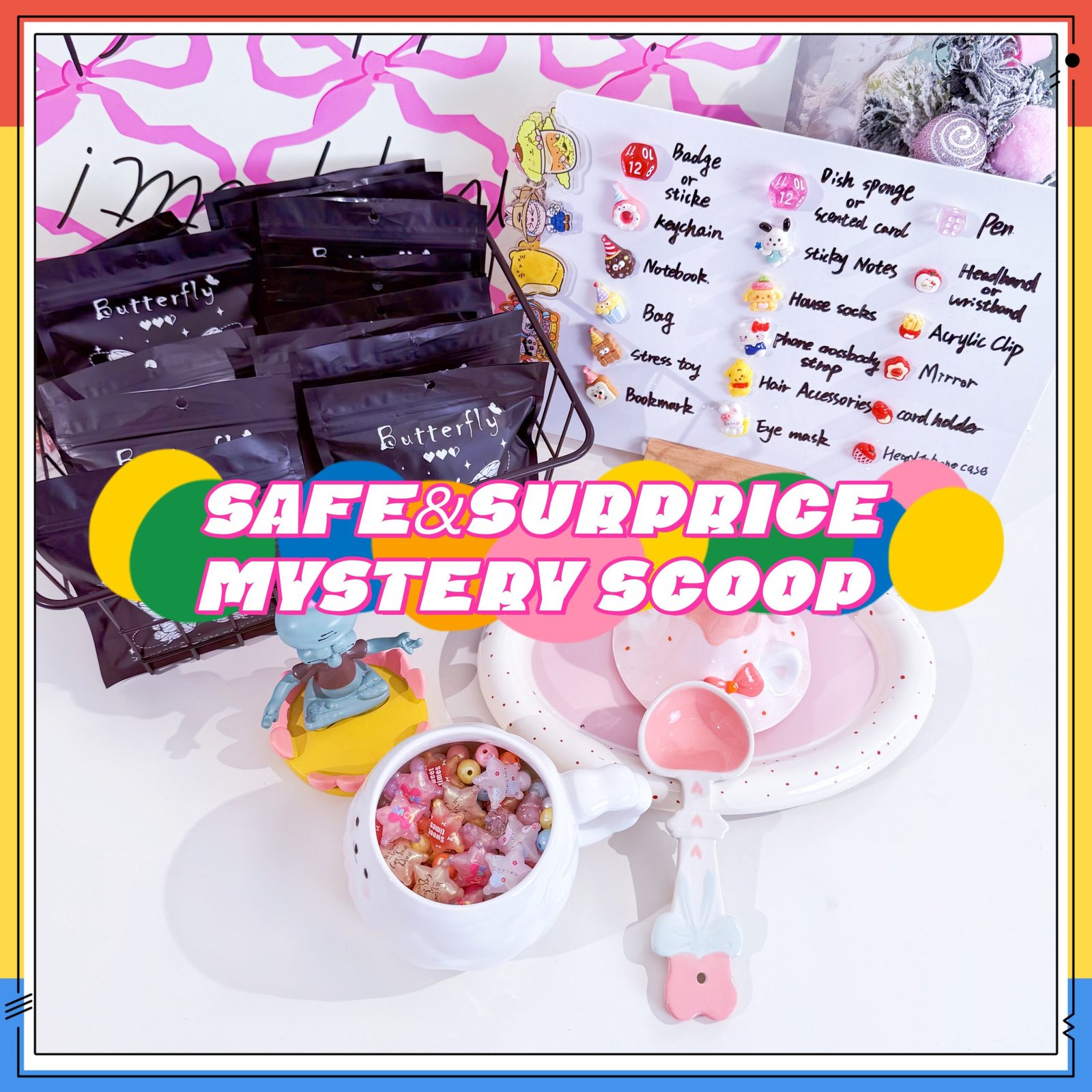 We have a box full of lucky bags and a blackboard filled with surprise products. The bags contain our self-defense items and surprise particles, and the surprise particles correspond to the products on the blackboard. We will use a method of scooping once or twice to determine which products you will receive in the package. If the amount of product you scoop is small, we may sometimes add extra products.